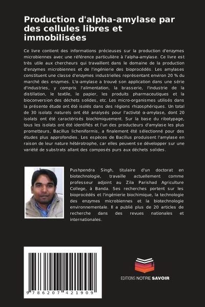 Ce livre contient des informations précieuses sur la production d'enzymes microbiennes avec une référence particulière à l'alpha-amylase. Ce livre est très utile aux chercheurs qui travaillent dans le domaine de la production d'enzymes microbiennes et de l'ingénierie des bioprocédés. Les amylases constituent une classe d'enzymes industrielles représentant environ 20 % du marché des enzymes. L' -amylase a trouvé son application dans une série d'industries, y compris l'alimentation, la brasserie, l'industrie de la distillation, le textile, le papier, les produits pharmaceutiques et la bioconversion des déchets solides, etc. Les micro-organismes utilisés dans la présente étude ont été isolés dans des régions rhizosphériques. Un total de 30 isolats naturels ont été analysés pour l'activité -amylase, dont 20 isolats ont été caractérisés biochimiquement. Sur la base du ribotypage, tous les isolats ont été identifiés et l'un des producteurs d'amylase les plus prometteurs, Bacillus licheniformis, a finalement été sélectionné pour des études plus approfondies. Les espèces de Bacillus produisent l'amylase en raison de leur nature hétérotrophe, car elles peuvent se développer sur une variété de substrats allant des composés purs aux déchets solides.