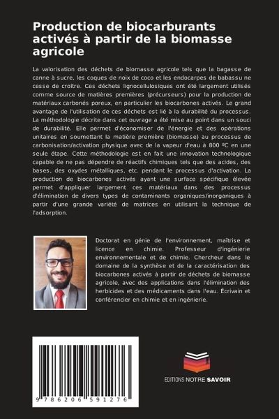 La valorisation des déchets de biomasse agricole tels que la bagasse de canne à sucre, les coques de noix de coco et les endocarpes de babassu ne cesse de croître. Ces déchets lignocellulosiques ont été largement utilisés comme source de matières premières (précurseurs) pour la production de matériaux carbonés poreux, en particulier les biocarbones activés. Le grand avantage de l'utilisation de ces déchets est lié à la durabilité du processus. La méthodologie décrite dans cet ouvrage a été mise au point dans un souci de durabilité. Elle permet d'économiser de l'énergie et des opérations unitaires en soumettant la matière première (biomasse) au processus de carbonisation/activation physique avec de la vapeur d'eau à 800 ºC en une seule étape. Cette méthodologie est en fait une innovation technologique capable de ne pas dépendre de réactifs chimiques tels que des acides, des bases, des oxydes métalliques, etc. pendant le processus d'activation. La production de biocarbones activés ayant une surface spécifique élevée permet d'appliquer largement ces matériaux dans des processus d'élimination de divers types de contaminants organiques/inorganiques à partir d'une grande variété de matrices en utilisant la technique de l'adsorption.