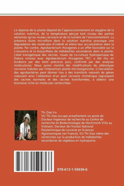 La réponse de la plante dépend de l approvisionnement en oxygène de la solution nutritive, de la température perçue tant niveau des parties aériennes qu au niveau racinaire et de la lumière de l environnement. La présence d'une microflore dans la solution nutritive provoque une dégradation des molécules d intérêt et altère leur accumulation dans la plante. Par contre, Agrobacterium rhizogenes a un effet favorable sur la croissance et la biosynthèse de métabolites secondaires dans la plante. L état transgénique des racines, issues de co-culture hydroponique de Datura innoxia avec Agrobacterium rhizogenes TR7, a été mis en évidence par des tests précoces puis, confirmé par des analyses moléculaires. Nous avons montré des modifications du phénotype racinaire induites par l'interaction plante-microorganisme. L inoculation des agrobactéries peut donner lieu à des transferts naturels de gènes induisant ainsi l obtention d un pool racinaire chimérique regroupant des racines normales et des racines transformées, à obtenir une biomasse riche en molécules recherchées.