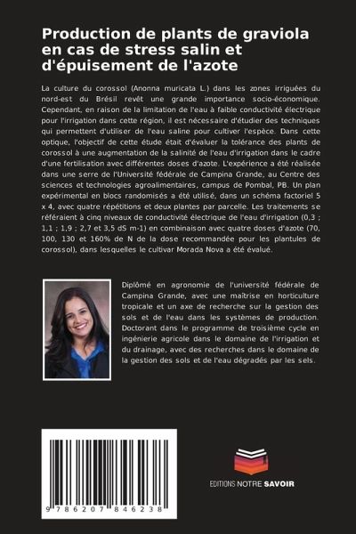 La culture du corossol (Anonna muricata L.) dans les zones irriguées du nord-est du Brésil revêt une grande importance socio-économique. Cependant, en raison de la limitation de l'eau à faible conductivité électrique pour l'irrigation dans cette région, il est nécessaire d'étudier des techniques qui permettent d'utiliser de l'eau saline pour cultiver l'espèce. Dans cette optique, l'objectif de cette étude était d'évaluer la tolérance des plants de corossol à une augmentation de la salinité de l'eau d'irrigation dans le cadre d'une fertilisation avec différentes doses d'azote. L'expérience a été réalisée dans une serre de l'Université fédérale de Campina Grande, au Centre des sciences et technologies agroalimentaires, campus de Pombal, PB. Un plan expérimental en blocs randomisés a été utilisé, dans un schéma factoriel 5 x 4, avec quatre répétitions et deux plantes par parcelle. Les traitements se référaient à cinq niveaux de conductivité électrique de l'eau d'irrigation (0,3 ; 1,1 ; 1,9 ; 2,7 et 3,5 dS m-1) en combinaison avec quatre doses d'azote (70, 100, 130 et 160% de N de la dose recommandée pour les plantules de corossol), dans lesquelles le cultivar Morada Nova a été évalué.