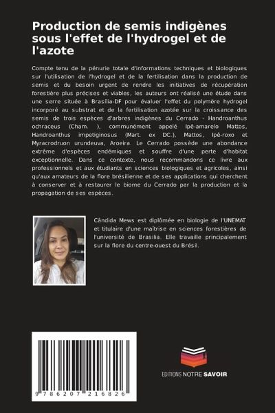Compte tenu de la pénurie totale d'informations techniques et biologiques sur l'utilisation de l'hydrogel et de la fertilisation dans la production de semis et du besoin urgent de rendre les initiatives de récupération forestière plus précises et viables, les auteurs ont réalisé une étude dans une serre située à Brasília-DF pour évaluer l'effet du polymère hydrogel incorporé au substrat et de la fertilisation azotée sur la croissance des semis de trois espèces d'arbres indigènes du Cerrado - Handroanthus ochraceus (Cham. ), communément appelé Ipê-amarelo Mattos, Handroanthus impetiginosus (Mart. ex DC.), Mattos, Ipê-roxo et Myracrodruon urundeuva, Aroeira. Le Cerrado possède une abondance extrême d'espèces endémiques et souffre d'une perte d'habitat exceptionnelle. Dans ce contexte, nous recommandons ce livre aux professionnels et aux étudiants en sciences biologiques et agricoles, ainsi qu'aux amateurs de la flore brésilienne et de ses applications qui cherchent à conserver et à restaurer le biome du Cerrado par la production et la propagation de ses espèces.