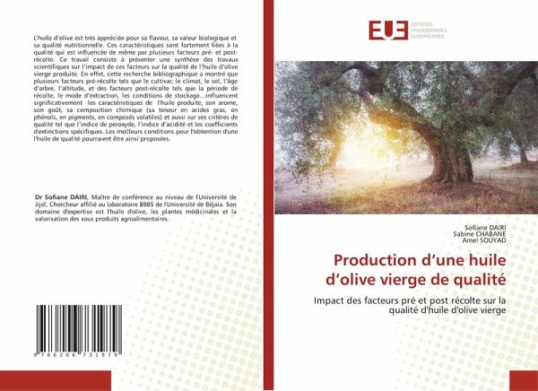 L'huile d'olive est très appréciée pour sa flaveur, sa valeur biologique et sa qualité nutritionnelle. Ces caractéristiques sont fortement liées à la qualité qui est influencée de même par plusieurs facteurs pré- et post-récolte. Ce travail consiste à présenter une synthèse des travaux scientifiques sur l'impact de ces facteurs sur la qualité de l'huile d'olive vierge produite. En effet, cette recherche bibliographique a montré que plusieurs facteurs pré-récolte tels que le cultivar, le climat, le sol, l'âge d'arbre, l'altitude, et des facteurs post-récolte tels que la période de récolte, le mode d'extraction, les conditions de stockage...influencent significativement les caractéristiques de l'huile produite, son arome, son goût, sa composition chimique (sa teneur en acides gras, en phénols, en pigments, en composés volatiles) et aussi sur ses critéres de qualité tel que l'indice de peroxyde, l'indice d'acidité et les coefficients d'extinctions spécifiques. Les meilleurs conditions pour l'obtention d'une l'huile de qualité pourraient être ainsi proposées.