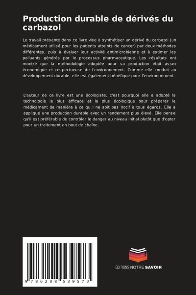 Le travail présenté dans ce livre vise à synthétiser un dérivé du carbazol (un médicament utilisé pour les patients atteints de cancer) par deux méthodes différentes, puis à évaluer leur activité antimicrobienne et à estimer les polluants générés par le processus pharmaceutique. Les résultats ont montré que la méthodologie adoptée pour sa production était assez économique et respectueuse de l'environnement. Comme elle conduit au développement durable, elle est également bénéfique pour l'environnement.