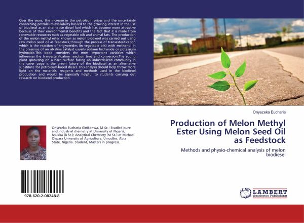 Over the years, the increase in the petroleum prices and the uncertainty concerning petroleum availability has led to the growing interest in the use of biodiesel as an alternative diesel fuel which has become more attractive because of their environmental benefits and the fact that it is made from renewable resources such as vegetable oils and animal fats. The production of the melon methyl ester known as melon biodiesel was carried out using raw melon seed oil as feedstock,through the process of transesterification which is the reaction of triglycerides (in vegetable oils) with methanol in the presence of an alkaline catalyst usually sodium hydroxide or potassium hydroxide.This book considers the most important variables which influences the transesterification reaction time and conversion.The young plant sprouting on a hard surface facing an industrialized community in the cover page is the green future of the biodiesel as an alternative substitute for petroleum-based diesel. This analysis should help throw more light on the materials, reagents and methods used in the biodiesel production and would be especially helpful to students carrying out research on biodiesel production.