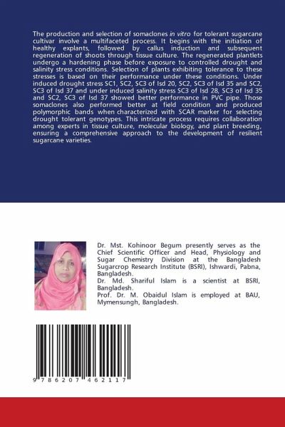 The production and selection of somaclones in vitro for tolerant sugarcane cultivar involve a multifaceted process. It begins with the initiation of healthy explants, followed by callus induction and subsequent regeneration of shoots through tissue culture. The regenerated plantlets undergo a hardening phase before exposure to controlled drought and salinity stress conditions. Selection of plants exhibiting tolerance to these stresses is based on their performance under these conditions. Under induced drought stress SC1, SC2, SC3 of Isd 20, SC2, SC3 of Isd 35 and SC2, SC3 of Isd 37 and under induced salinity stress SC3 of Isd 28, SC3 of Isd 35 and SC2, SC3 of Isd 37 showed better performance in PVC pipe. Those somaclones also performed better at field condition and produced polymorphic bands when characterized with SCAR marker for selecting drought tolerant genotypes. This intricate process requires collaboration among experts in tissue culture, molecular biology, and plant breeding, ensuring a comprehensive approach to the development of resilient sugarcane varieties.