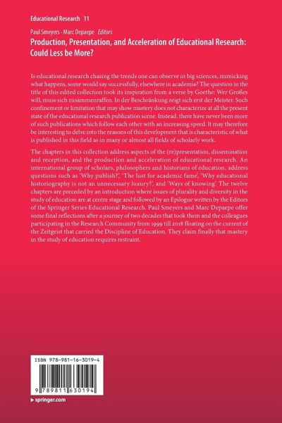 The chapters in this collection address aspects of the (re)presentation, dissemination and reception, and the production and acceleration of educational research. An international group of scholars, philosophers and historians of education, address questions such as 'Why publish?', 'The lust for academic fame', 'Why educational historiography is not an unnecessary luxury?', and 'Ways of knowing'. The twelve chapters are preceded by an introduction where issues of plurality and diversity in the study of education are at centre stage and followed by an Epilogue written by the Editors of the Springer Series Educational Research. Paul Smeyers and Marc Depaepe offer some final reflections after a journey of two decades that took them and the colleagues participating in the Research Community from 1999 till 2018 floating on the current of the Zeitgeist that carried the Discipline of Education. They claim finally that mastery in the study of education requires restraint.