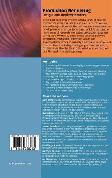 In the past, rendering systems used a range of different approaches, each compatible and able to handle certain kinds of images. However, the last few years have seen the development of practical techniques, which bring together many areas of research into stable, production ready rendering tools. Production Rendering: Design and Implementation is written by experienced graphics software developers and discusses the techniques they have used to implement feature film quality rendering engines.