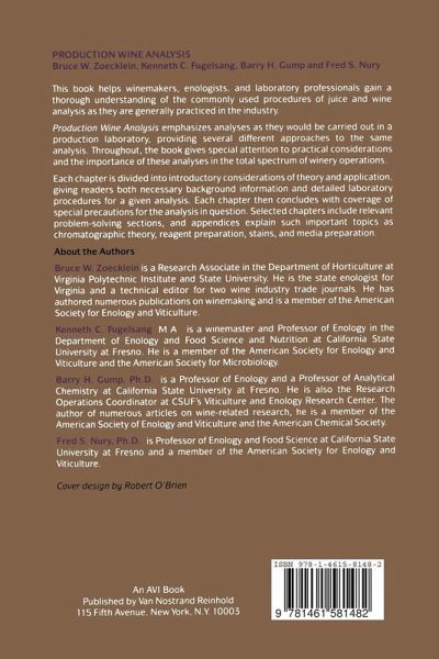 This text is designed to acquaint the reader with the commonly used procedures of juice and wine analysis as they are generally practiced in the industry, and as they are taught in the Department of Enology at California State University, Fresno. It is assumed that the reader has a basic preparation in the fields of chemistry and microbiology. In developing material for this text, the authors have emphasized analyses as they would be carried out in a production laboratory. Realizing that different laboratories have different analytical capabilities, personnel as well as equip ment, we have in many instances provided several different approaches to the same analysis. Throughout this book we have attempted to give special attention to practical considerations and the importance of these analyses in the total spectrum of winery operations. We hope the book's format will satisfy the inter ests oflaboratory personnel as well as winemakers. The process of making wine involves a series of concerns for the winemaker and staff of a winery. The first concerns are viticultural. Upon arrival of the fruit, its quality is assessed, grapes are processed and fermentation is begun. Almost immediately, and in many instances simultaneously, chemical and microbiological stability of the young and/or aging wine become important. Finally, problems do occur on occasion, and a number of what may be consid ered remedial techniques can be employed to produce an acceptable product.