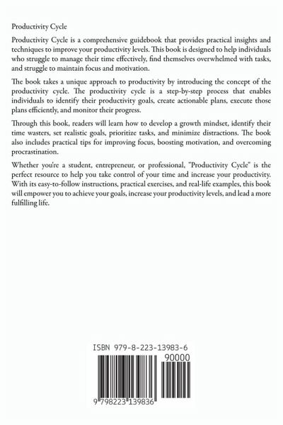 Productivity Cycle Productivity Cycle is a comprehensive guidebook that provides practical insights and techniques to improve your productivity levels. This book is designed to help individuals who struggle to manage their time effectively, find themselves overwhelmed with tasks, and struggle to maintain focus and motivation. The book takes a unique approach to productivity by introducing the concept of the productivity cycle. The productivity cycle is a step-by-step process that enables individuals to identify their productivity goals, create actionable plans, execute those plans efficiently, and monitor their progress. Through this book, readers will learn how to develop a growth mindset, identify their time wasters, set realistic goals, prioritize tasks, and minimize distractions. The book also includes practical tips for improving focus, boosting motivation, and overcoming procrastination. Whether you're a student, entrepreneur, or professional, "Productivity Cycle" is the perfect resource to help you take control of your time and increase your productivity. With its easy-to-follow instructions, practical exercises, and real-life examples, this book will empower you to achieve your goals, increase your productivity levels, and lead a more fulfilling life.