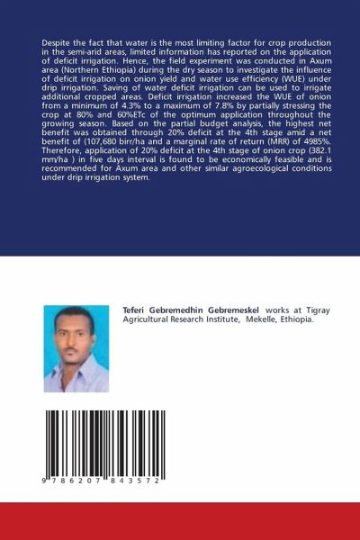 Despite the fact that water is the most limiting factor for crop production in the semi-arid areas, limited information has reported on the application of deficit irrigation. Hence, the field experiment was conducted in Axum area (Northern Ethiopia) during the dry season to investigate the influence of deficit irrigation on onion yield and water use efficiency (WUE) under drip irrigation. Saving of water deficit irrigation can be used to irrigate additional cropped areas. Deficit irrigation increased the WUE of onion from a minimum of 4.3% to a maximum of 7.8% by partially stressing the crop at 80% and 60%ETc of the optimum application throughout the growing season. Based on the partial budget analysis, the highest net benefit was obtained through 20% deficit at the 4th stage amid a net benefit of (107,680 birr/ha and a marginal rate of return (MRR) of 4985%. Therefore, application of 20% deficit at the 4th stage of onion crop (382.1 mm/ha ) in five days interval is found to be economically feasible and is recommended for Axum area and other similar agroecological conditions under drip irrigation system.