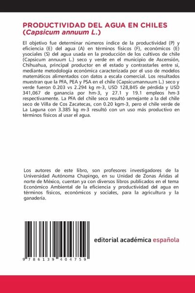 El objetivo fue determinar números índice de la productividad (P) y eficiencia (E) del agua (A) en términos físicos (F), económicos (E) ysociales (S) del agua usada en la producción de los cultivos de chile (Capsicum annuum L.) seco y verde en el municipio de Ascensión, Chihuahua, principal productor en el estado y contrastarles entre sí, mediante metodología económica caracterizada por el uso de modelos matemáticos alimentados con datos a escala comercial. Los resultados muestran que la PFA, PEA y PSA en el chile (Capsicumannuum L.) seco y verde fueron 0.203 vs 2.294 kg m-3, USD 128,845 de pérdida y USD 341,067 de ganancia por hm-3, y 27.1 y 19.1 empleos hm-3 respectivamente. La PFA del chile seco resultó semejante a la del chile seco de Villa de Cos Zacatecas, con 0.20 kgm-3, pero el chile verde de La Laguna con 3.385 kg m-3 resultó con un uso más productivo en términos físicos al usar el agua.