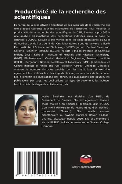 L'analyse de la productivité scientifique et des résultats de la recherche est une pratique courante pour les institutions de recherche. Pour mesurer la productivité de la recherche des scientifiques du CSIR, l'auteur a procédé à une analyse bibliométrique des publications indexées dans la base de données SCOPUS. L'étude a été menée dans les sept laboratoires du CSIR du nord-est et de l'est de l'Inde. Ces laboratoires sont les suivants : North East Institute of Science and Technology (NEIST), Jorhat ; Central Glass and Ceramic Research Institute (CGCRI), Kolkata ; Indian Institute of Chemical Biology (IICB), Kolkata ; Institute of Minerals and Materials Technology (IMMT), Bhubaneswar ; Central Mechanical Engineering Research Institute (CMERI), Durgapur ; National Metallurgical Laboratory (NML), Jamshedpur et Central Institute of Mining and Fuel Research (CIMFR), Dhanbad. L'étude a analysé le nombre d'articles publiés par les institutions et examine également les citations les plus importantes reçues au cours de la période. Elle a identifié les publications par année, les publications par source, les publications par pays, les publications par type de document, les auteurs les plus cités, le degré de collaboration, etc.