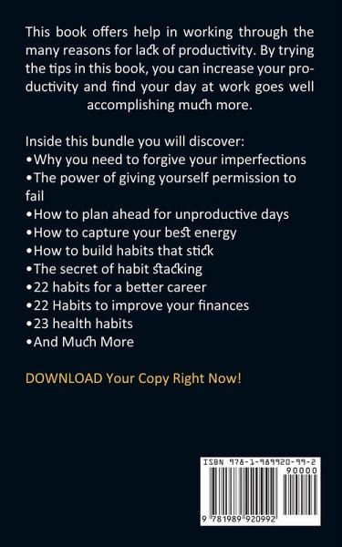 This book offers help in working through the many reasons for lack of productivity. By trying the tips in this book, you can increase your productivity and find your day at work goes well accomplishing much more. Inside this bundle you will discover:Why you need to forgive your imperfectionsThe power of giving yourself permission to failHow to plan ahead for unproductive daysHow to capture your best energyHow to build habits that stickThe secret of habit stacking22 habits for a better career22 Habits to improve your finances23 health habitsAnd Much More DOWNLOAD Your Copy Right Now!