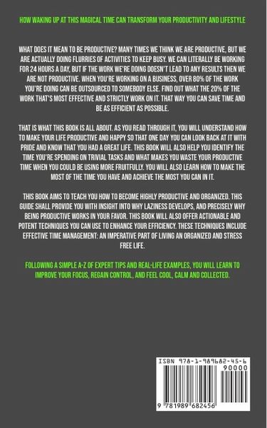 How Waking Up At This Magical Time Can Transform Your Productivity And Lifestyle What does it mean to be productive? Many times we think we are productive, but we are actually doing flurries of activities to keep busy. We can literally be working for 24 hours a day, but if the work we're doing doesn't lead to any results then we are not productive. When you're working on a business, over 80% of the work you're doing can be outsourced to somebody else. Find out what the 20% of the work that's most effective and STRICTLY work on it. That way you can save time and be as efficient as possible. That is what this book is all about. As you read through it, you will understand how to make your life productive and happy so that one day you can look back at it with pride and know that you had a great life. This book will also help you identify the time you're spending on trivial tasks and what makes you waste your productive time when you could be using more fruitfully. You will also learn how to make the most of the time you have and achieve the most you can in it. Here Is A Preview Of What You'll Learn... How to Assess Your Day How to Prioritize How To Make a Perfect To-do list How to Stop Procrastinating How to Schedule Your Day How to Declutter and Organize How to Avoid Distractions How to Manage Stress And much, much more! This book aims to teach you how to become highly productive and organized. This guide shall provide you with insight into why laziness develops, and precisely why being productive works in your favor. This book will also offer actionable and potent techniques you can use to enhance your efficiency. These techniques include effective time management: an imperative part of living an organized and stress free life. Following a simple A-Z of expert tips and real-life examples, you will learn to improve your focus, regain control, and feel cool, calm and collected.