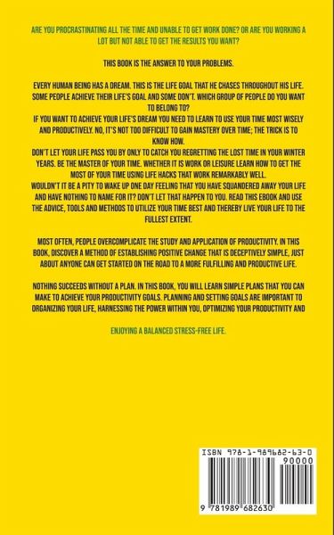 Are you procrastinating all the time and unable to get work done? Or are you working a lot but not able to get the results you want? This book is the answer to your problems. Every human being has a dream. This is the life goal that he chases throughout his life. Some people achieve their life’s goal and some don’t. Which group of people do you want to belong to? If you want to achieve your life’s dream you need to learn to use your time most wisely and productively. No, it’s not too difficult to gain mastery over time; the trick is to know HOW. Don’t let your life pass you by only to catch you regretting the lost time in your winter years. Be the master of your time. Whether it is work or leisure learn how to get the most of your time using life hacks that work remarkably well. Wouldn't it be a pity to wake up one day feeling that you have squandered away your life and have nothing to name for it? Don’t let that happen to you. Read this eBook and use the advice, tools and methods to utilize your time best and thereby live your life to the fullest extent. In this book you will learn: Create A Not To-Do List The Power Of Preparation Build Your Daily Routine Time Saving Habits The "What If" Technique Eliminate Distraction How To Overcome Procrastination and much more Most often, people overcomplicate the study and application of productivity. In this book, discover a method of establishing positive change that is deceptively simple, just about anyone can get started on the road to a more fulfilling and productive life. Nothing succeeds without a plan. In this book, you will learn simple plans that you can make to achieve your productivity goals. Planning and setting goals are important to organizing your life, harnessing the power within you, optimizing your productivity and enjoying a balanced stress-free life. Get this book to learn more about how to optimize your productivity.,/b>