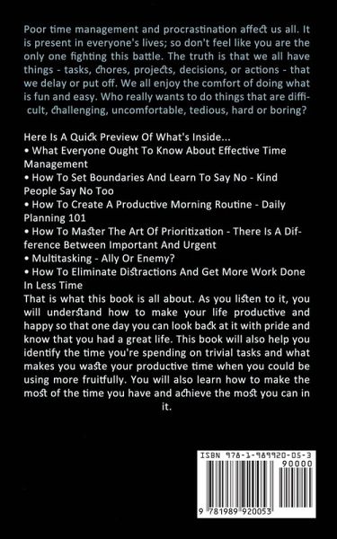 Poor time management and procrastination affect us all. It is present in everyone's lives; so don't feel like you are the only one fighting this battle. The truth is that we all have things - tasks, chores, projects, decisions, or actions - that we delay or put off. We all enjoy the comfort of doing what is fun and easy. Who really wants to do things that are difficult, challenging, uncomfortable, tedious, hard or boring? Here Is A Quick Preview Of What's Inside... • What Everyone Ought To Know About Effective Time Management • How To Set Boundaries And Learn To Say No - Kind People Say No Too • How To Create A Productive Morning Routine - Daily Planning 101 • How To Master The Art Of Prioritization - There Is A Difference Between Important And Urgent • Multitasking - Ally Or Enemy? • How To Eliminate Distractions And Get More Work Done In Less Time That is what this book is all about. As you listen to it, you will understand how to make your life productive and happy so that one day you can look back at it with pride and know that you had a great life. This book will also help you identify the time you're spending on trivial tasks and what makes you waste your productive time when you could be using more fruitfully. You will also learn how to make the most of the time you have and achieve the most you can in it.