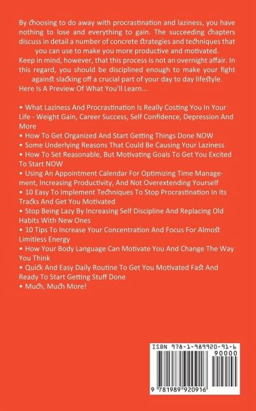 By choosing to do away with procrastination and laziness, you have nothing to lose and everything to gain. The succeeding chapters discuss in detail a number of concrete strategies and techniques that you can use to make you more productive and motivated.Keep in mind, however, that this process is not an overnight affair. In this regard, you should be disciplined enough to make your fight against slacking off a crucial part of your day to day lifestyle.Here Is A Preview Of What You'll Learn...What Laziness And Procrastination Is Really Costing You In Your Life - Weight Gain, Career Success, Self Confidence, Depression And MoreHow To Get Organized And Start Getting Things Done NOWSome Underlying Reasons That Could Be Causing Your LazinessHow To Set Reasonable, But Motivating Goals To Get You Excited To Start NOWUsing An Appointment Calendar For Optimizing Time Management, Increasing Productivity, And Not Overextending Yourself10 Easy To Implement Techniques To Stop Procrastination In Its Tracks And Get You MotivatedStop Being Lazy By Increasing Self Discipline And Replacing Old Habits With New Ones10 Tips To Increase Your Concentration And Focus For Almost Limitless EnergyHow Your Body Language Can Motivate You And Change The Way You ThinkQuick And Easy Daily Routine To Get You Motivated Fast And Ready To Start Getting Stuff DoneMuch, Much More!