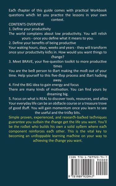 Each chapter of this guide comes with practical Workbook questions which let you practice the lessons in your own context. CONTENTS OVERVIEW 1. Define your productivity The world complains about low productivity. You will relish yours - once you define what it means to you. 2. Define your benefits of being productive Your waking hours, days, weeks and years - they will transform once your productivity kicks in. How would you want things to change? 3. Meet BRAVE, your five-question toolkit to more productive times You are the best person to start making the most out of your time. Help yourself to this five-step process and start hacking away. 4. Find the BIG idea to gain energy and focus There are many kinds of motivation. You can find yours by dreaming big. 5. Focus on what is REAL to discover tools, resources, and allies Your everyday life can be an obstacle course or a treasure trove of good stuff. You will gain momentum once you learn to see the useful and the tricky bits. Simple proven, experienced, and research-backed techniques guarantee you sustain the change get the life you want. You'll be the rocket who builds his own a solid system where each component reinforces each other. This is the vital key to becoming an unstoppable learning machine on your way to achieving the change you want.