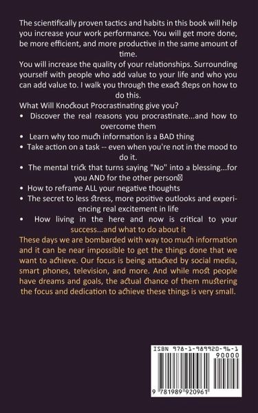 The scientifically proven tactics and habits in this book will help you increase your work performance. You will get more done, be more efficient, and more productive in the same amount of time. You will increase the quality of your relationships. Surrounding yourself with people who add value to your life and who you can add value to. I walk you through the exact steps on how to do this. What Will Knockout Procrastinating give you?· Discover the real reasons you procrastinate...and how to overcome them · Learn why too much information is a BAD thing · Take action on a task -- even when you're not in the mood to do it. · The mental trick that turns saying "No" into a blessing...for you AND for the other person¿· How to reframe ALL your negative thoughts · The secret to less stress, more positive outlooks and experiencing real excitement in life · How living in the here and now is critical to your success...and what to do about it These days we are bombarded with way too much information and it can be near impossible to get the things done that we want to achieve. Our focus is being attacked by social media, smart phones, television, and more. And while most people have dreams and goals, the actual chance of them mustering the focus and dedication to achieve these things is very small.