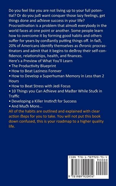 Do you feel like you are not living up to your full potential? Or do you just want conquer those lazy feelings, get things done and achieve success in your life? Procrastination is a problem that almost everybody in the world faces at one point or another. Some people learn how to overcome it by forming good habits and others suffer for years by constantly putting things off. In fact, 20% of Americans identify themselves as chronic procrastinators and admit that it begins to destroy their self-confidence, relationships, health, and finances.Here's a Preview of What You'll LearnThe Productivity BlueprintHow to Beat Laziness ForeverHow to Develop a Superhuman Memory in Less than 2 HoursHow to Beat Stress with Jedi Focus10 Things you Can Achieve and Master While Stuck in TrafficDeveloping a Killer Instinct for SuccessAnd Much More... All of the habits are outlined and explained with clear action steps for you to take. You will not put this book down confused, this is your roadmap to a higher quality life.