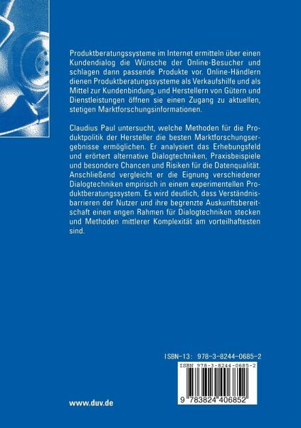 Claudius Paul untersucht, welche Methoden für die Produktpolitik der Hersteller die besten Marktforschungsergebnisse ermöglichen. Er analysiert das Erhebungsfeld und erörtert alternative Dialogtechniken, Praxisbeispiele und besondere Chancen und Risiken für die Datenqualität. Anschließend vergleicht er die Eignung verschiedener Dialogtechniken empirisch in einem experimentellen Produktberatungssystem. Es wird deutlich, dass Verständnisbarrieren der Nutzer und ihre begrenzte Auskunftsbereitschaft einen engen Rahmen für Dialogtechniken stecken und Methoden mittlerer Komplexität am vorteilhaftesten sind.
