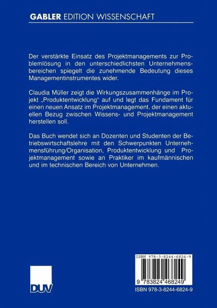 Claudia Müller zeigt die Wirkungszusammenhänge im Projekt "Produktentwicklung" auf und legt das Fundament für einen neuen Ansatz im Projektmanagement, der einen aktuellen Bezug zwischen Wissens- und Projektmanagement herstellen soll.