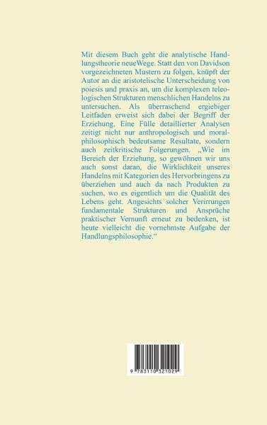 Mit diesem Buch geht die analytische Handlungstheorie neue Wege. Statt den von Davidson vorgezeichneten Mustern zu folgen, knüpft der Autor an die aristotelische Unterscheidung von poiesis und praxis an, um die komplexen teleologischen Strukturen menschlichen Handelns zu untersuchen. Als überraschend ergiebiger Leitfaden erweist sich dabei der Begriff der Erziehung. Eine Fülle detaillierter Analysen zeitigt nicht nur anthropologisch und moralphilosophisch bedeutsame Resultate, sondern auch zeitkritische Folgerungen. 'Wie im Bereich der Erziehung, so gewöhnen wir uns auch sonst daran, die Wirklichkeit unseres Handelns mit Kategorien des Hervorbringens zu überziehen und auch da nach Produkten zu suchen, wo es eigentlich um die Qualität des Lebens geht. Angesichts solcher Verirrungen fundamentale Strukturen und Ansprüche praktischer Vernunft erneut zu bedenken, ist heute vielleicht die vornehmste Aufgabe der Handlungsphilosophie.'