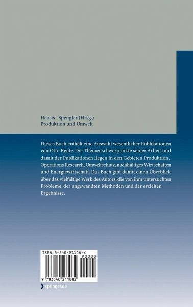 Dieses Buch enthält eine Auswahl wesentlicher Publikationen von Otto Rentz. Die Themenschwerpunkte seiner Arbeit und damit der Publikationen liegen in den Gebieten Produktion, Operations Research, Umweltschutz, nachhaltiges Wirtschaften und Energiewirtschaft. Das Buch gibt damit einen Überblick über das vielfältige Werk des Autors, die von ihm untersuchten Probleme, der angewandten Methoden und der erzielten Ergebnisse.