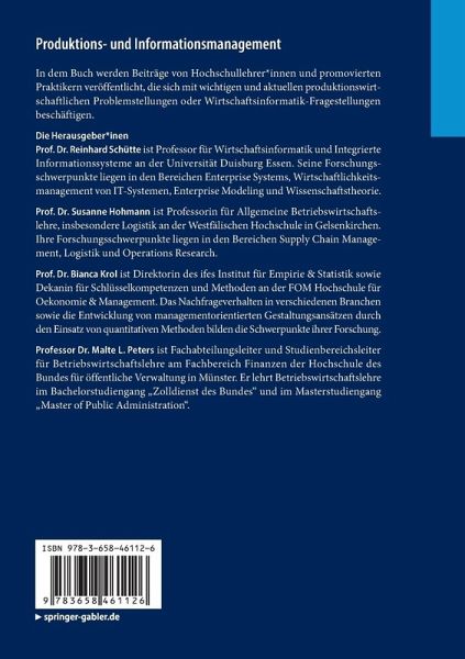 Prof. Dr. Reinhard Schütte ist Professor für Wirtschaftsinformatik und Integrierte Informationssysteme an der Universität Duisburg Essen. Seine Forschungsschwerpunkte liegen in den Bereichen Enterprise Systems, Wirtschaftlichkeitsmanagement von IT-Systemen, Enterprise Modeling und Wissenschaftstheorie. Prof. Dr. Susanne Hohmann ist Professorin für Allgemeine Betriebswirtschaftslehre, insbesondere Logistik an der Westfälischen Hochschule in Gelsenkirchen. Ihre Forschungsschwerpunkte liegen in den Bereichen Supply Chain Management, Logistik und Operations Research. Prof. Dr. Bianca Krol ist Direktorin des ifes Institut für Empirie & Statistik sowie Dekanin für Schlüsselkompetenzen und Methoden an der FOM Hochschule für Oekonomie & Management. Das Nachfrageverhalten in verschiedenen Branchen sowie die Entwicklung von managementorientierten Gestaltungsansätzen durch den Einsatz von quantitativen Methoden bilden die Schwerpunkte ihrer Forschung. Professor Dr. Malte L. Peters ist Fachabteilungsleiter und Studienbereichsleiter für Betriebswirtschaftslehre am Fachbereich Finanzen der Hochschule des Bundes für öffentliche Verwaltung in Münster. Er lehrt Betriebswirtschaftslehre im Bachelorstudiengang "Zolldienst des Bundes" und im Masterstudiengang "Master of Public Administration".