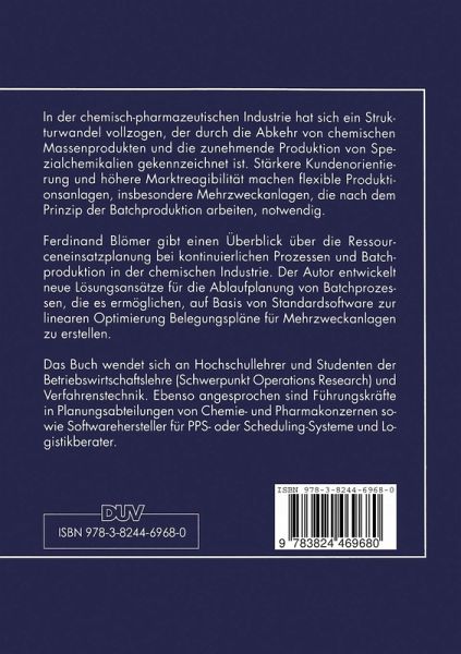 In der chemisch-pharmazeutischen Industrie hat sich ein Strukturwandel vollzogen, der durch die Abkehr von chemischen Massenprodukten und die zunehmende Produktion von Spezialchemikalien gekennzeichnet ist. Stärkere Kundenorientierung und höhere Marktreagibilität machen flexible Produktionsanlagen notwendig, insbesondere Mehrzweckanlagen, die nach dem Prinzip der Batchproduktion arbeiten. Ferdinand Blömer gibt einen Überblick über die Ressourceneinsatzplanung bei kontinuierlichen Prozessen und Batchproduktion in der chemischen Industrie. Der Autor entwickelt neue Lösungsansätze für die Ablaufplanung von Batchprozessen, die es ermöglichen, auf Basis von Standardsoftware zur linearen Optimierung Belegungspläne für Mehrzweckanlagen zu erstellen.