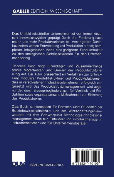 Das Umfeld industrieller Unternehmen ist von immer kürzeren Innovationszyklen geprägt. Durch die Forderung nach mehr und mehr Produktvarianten bei verringerten Durchlaufzeiten werden Entwicklung und Produktion ständig komplexer. Infolgedessen zählt eine geeignete Produktstruktur zu den strategischen Schlüsselfaktoren für den Unternehmenserfolg. Thomas Rapp zeigt Grundlagen und Zusammenhänge sowie Möglichkeiten und Grenzen der Produktstrukturierung auf. Der Autor präsentiert ein Verfahren zur Entwicklung modularer Produktstrukturen und Produktplattformen, das in verschiedenen Industrieunternehmen erfolgreich eingesetzt wird. Das Produktstrukturmanagement wird abgerundet durch Erzeugnisgliederungen für Vertrieb und Produktion sowie organisatorische Maßnahmen zur Sicherung der Produktstruktur.