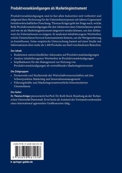 Produktvorankündigungen sind in fast allen Industrien weit verbreitet und aufgrund ihrer Bedeutung für die Unternehmenspraxis seit Jahren Gegenstand betriebswirtschaftlicher Forschung. Thomas Krüger geht der Frage nach, welche Rolle Produktvorankündigungen für den Aktienwert eines Unternehmens spielen und wie sie als Marketinginstrument eingesetzt werden können, um den Aktienwert des Unternehmens zu steigern. Er analysiert inhaltsbezogene Werttreiber, welche Unternehmen bewusst kommunizieren können, um die Wertgenerierung zu beeinflussen. Seine empirische Untersuchung basiert auf einer Studie mit Informationen über mehr als 1.400 Produkte aus fünf verschiedenen Branchen.