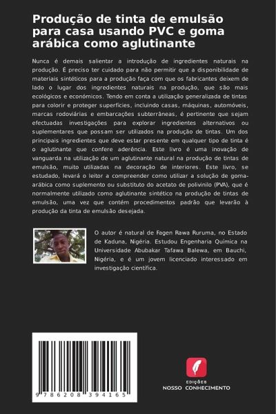 Nunca é demais salientar a introdução de ingredientes naturais na produção. É preciso ter cuidado para não permitir que a disponibilidade de materiais sintéticos para a produção faça com que os fabricantes deixem de lado o lugar dos ingredientes naturais na produção, que são mais ecológicos e económicos. Tendo em conta a utilização generalizada de tintas para colorir e proteger superfícies, incluindo casas, máquinas, automóveis, marcas rodoviárias e embarcações subterrâneas, é pertinente que sejam efectuadas investigações para explorar ingredientes alternativos ou suplementares que possam ser utilizados na produção de tintas. Um dos principais ingredientes que deve estar presente em qualquer tipo de tinta é o aglutinante que confere aderência. Este livro é uma inovação de vanguarda na utilização de um aglutinante natural na produção de tintas de emulsão, muito utilizadas na decoração de interiores. Este livro, se estudado, levará o leitor a compreender como utilizar a solução de goma-arábica como suplemento ou substituto do acetato de polivinilo (PVA), que é normalmente utilizado como aglutinante sintético na produção de tintas de emulsão, uma vez que contém procedimentos padrão que levarão à produção da tinta de emulsão desejada.