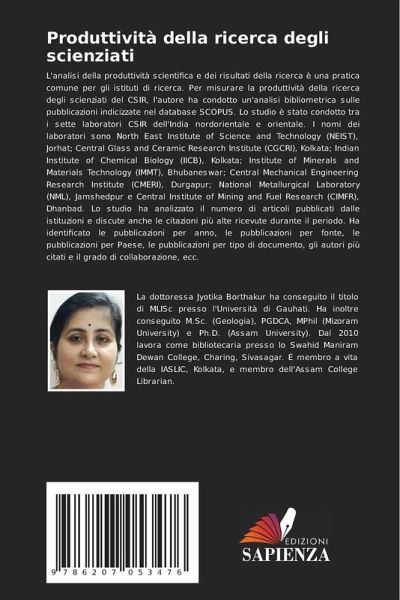 L'analisi della produttività scientifica e dei risultati della ricerca è una pratica comune per gli istituti di ricerca. Per misurare la produttività della ricerca degli scienziati del CSIR, l'autore ha condotto un'analisi bibliometrica sulle pubblicazioni indicizzate nel database SCOPUS. Lo studio è stato condotto tra i sette laboratori CSIR dell'India nordorientale e orientale. I nomi dei laboratori sono North East Institute of Science and Technology (NEIST), Jorhat; Central Glass and Ceramic Research Institute (CGCRI), Kolkata; Indian Institute of Chemical Biology (IICB), Kolkata; Institute of Minerals and Materials Technology (IMMT), Bhubaneswar; Central Mechanical Engineering Research Institute (CMERI), Durgapur; National Metallurgical Laboratory (NML), Jamshedpur e Central Institute of Mining and Fuel Research (CIMFR), Dhanbad. Lo studio ha analizzato il numero di articoli pubblicati dalle istituzioni e discute anche le citazioni più alte ricevute durante il periodo. Ha identificato le pubblicazioni per anno, le pubblicazioni per fonte, le pubblicazioni per Paese, le pubblicazioni per tipo di documento, gli autori più citati e il grado di collaborazione, ecc.