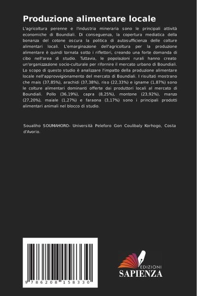 L'agricoltura perenne e l'industria mineraria sono le principali attività economiche di Boundiali. Di conseguenza, la copertura mediatica della bonanza del cotone oscura la politica di autosufficienza delle colture alimentari locali. L'emarginazione dell'agricoltura per la produzione alimentare è quindi tornata sotto i riflettori, creando una forte domanda di cibo nell'area di studio. Tuttavia, le popolazioni rurali hanno creato un'organizzazione socio-culturale per rifornire il mercato urbano di Boundiali. Lo scopo di questo studio è analizzare l'impatto della produzione alimentare locale nell'approvvigionamento del mercato di Boundiali. I risultati mostrano che mais (37,85%), arachidi (37,38%), riso (22,33%) e igname (1,87%) sono le colture alimentari dominanti offerte dai produttori locali al mercato di Boundiali. Pollo (36,19%), capra (8,25%), montone (23,92%), manzo (27,20%), maiale (1,27%) e faraona (3,17%) sono i principali prodotti alimentari animali nel blocco di studio.