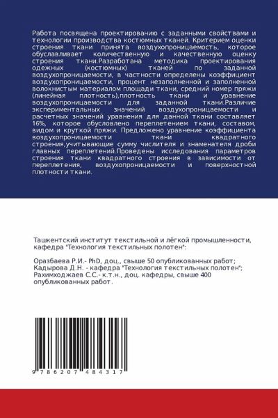 Rabota poswqschena proektirowaniü s zadannymi swojstwami i tehnologii proizwodstwa kostümnyh tkanej. Kriteriem ocenki stroeniq tkani prinqta wozduhopronicaemost', kotoroe obuslawliwaet kolichestwennuü i kachestwennuü ocenku stroeniq tkani.Razrabotana metodika proektirowaniq odezhnyh (kostümnyh) tkanej po zadannoj wozduhopronicaemosti, w chastnosti opredeleny koäfficient wozduhopronicaemosti, procent nezapolnennoj i zapolnennoj woloknistym materialom ploschadi tkani, srednij nomer prqzhi (linejnaq plotnost'),plotnost' tkani i urawnenie wozduhopronicaemosti dlq zadannoj tkani.Razlichie äxperimental'nyh znachenij wozduhopronicaemosti i raschetnyh znachenij urawneniq dlq dannoj tkani sostawlqet 16%, kotoroe obuslowleno perepleteniem tkani, sostawom, widom i krutkoj prqzhi. Predlozheno urawnenie koäfficienta wozduhopronicaemosti tkani kwadratnogo stroeniq,uchitywaüschie summu chislitelq i znamenatelq drobi glawnyh perepletenij.Prowedeny issledowaniq parametrow stroeniq tkani kwadratnogo stroeniq w zawisimosti ot perepleteniq, wozduhopronicaemosti i powerhnostnoj plotnosti tkani.