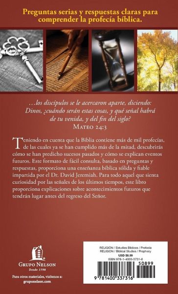 Por medio de respuestas breves y claras a preguntas frecuentes, el Dr. Jeremiah descifra y aclara la profecía para las personas comunes y corrientes. Él explica en términos simples lo que de otra manera podría ser misterioso e incluso aterrador, permitiéndoles a los lectores obtener una perspectiva equilibrada y esperanzadora del significado de los acontecimientos proféticos para sus vidas personales como creyentes en Cristo. También ayuda a los lectores a entender cómo la profecía se relaciona directamente con los acontecimientos mundiales en la actualidad. Prophecy Answer Book For anyone curious about prophecy and the signs of the end times, this book links the pieces of the prophecy puzzle in plain, simple language. There are 1,000 prophecies in the Bible so it's natural to wonder, have any prophecies been fulfilled? Do they really explain the future? Can we really know what will happen at the end of time? In succinct and clear answers to most frequently asked questions, Dr. Jeremiah decodes and clarifies prophecy for the average person. He explains in simple lay terms what could otherwise be mysterious and even frightening, allowing readers to gain a balanced and assuring perspective of the significance of prophetic events to their personal lives as believers in Christ. He also helps readers understand how prophecy is directly related to world events today.