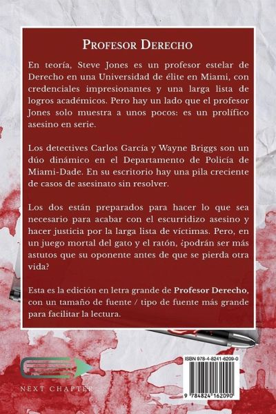 En teoría, Steve Jones es un profesor estelar de Derecho en una Universidad de élite en Miami, con credenciales impresionantes y una larga lista de logros académicos. Pero hay un lado que el profesor Jones solo muestra a unos pocos: es un prolífico asesino en serie. Los detectives Carlos García y Wayne Briggs son un dúo dinámico en el Departamento de Policía de Miami-Dade. En su escritorio hay una pila creciente de casos de asesinato sin resolver. Los dos están preparados para hacer lo que sea necesario para acabar con el escurridizo asesino y hacer justicia por la larga lista de víctimas. Pero, en un juego mortal del gato y el ratón, ¿podrán ser más astutos que su oponente antes de que se pierda otra vida? Esta es la edición en letra grande de Profesor Derecho, con un tamaño de fuente / tipo de fuente más grande para facilitar la lectura.