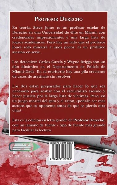 En teoría, Steve Jones es un profesor estelar de Derecho en una Universidad de élite en Miami, con credenciales impresionantes y una larga lista de logros académicos. Pero hay un lado que el profesor Jones solo muestra a unos pocos: es un prolífico asesino en serie. Los detectives Carlos García y Wayne Briggs son un dúo dinámico en el Departamento de Policía de Miami-Dade. En su escritorio hay una pila creciente de casos de asesinato sin resolver. Los dos están preparados para hacer lo que sea necesario para acabar con el escurridizo asesino y hacer justicia por la larga lista de víctimas. Pero, en un juego mortal del gato y el ratón, ¿podrán ser más astutos que su oponente antes de que se pierda otra vida? Esta es la edición en letra grande de Profesor Derecho, con un tamaño de fuente / tipo de fuente más grande para facilitar la lectura.