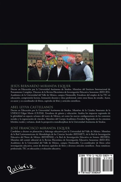 JESÚS BERNARDO MIRANDA ESQUER Doctor en Educación por la Universidad Autónoma de Sinaloa. Miembro del Instituto Internacional de Pensamiento Complejo. Director de la Revista Electrónica de Investigación Educativa Sonorense (RED-IES). Académico de la Universidad del Valle de México, campus Hermosillo. Estudioso del empleo de las TIC en educación, comprensión lectora, formación docente y ética profesional, entre otras líneas de estudio. Autor, co-autor y co-coordinador de libros, capítulos de libro y artículos científicos. ABEL LEYVA CASTELLANOS Doctor en Educación por la Universidad Autónoma de Sinaloa. Miembro de la Cátedra Itinerante de la UNESCO Edgar Morin (CIUEM). Estudioso de género y educación. Analiza los impactos regionales de la globalidad en espacio urbanos del norte de México, así como las nuevas configuraciones de los contextos sociales y la regeneración de vínculos. Miembro del Cuerpo Académico Estudios Regionales en los entornos híbridos rurales y urbanos, desde la perspectiva transdisciplinar de la Universidad Autónoma de Sinaloa. JOSÉ FRANCISCO MIRANDA ESQUER Candidato a doctor en planeación y liderazgo educativo por la Universidad del Valle de México. Miembro de la Red Latinoamericana de Metodología de las Ciencias Sociales (REDMET), de la Red de Investigación Educativa del Norte de México (REDIENM) y la Red de Investigación Educativa en Sonora (REDIES). Miembro del comité editorial de la Revista Electrónica de Investigación Educativa Sonorense (RED-IES). Académico de la Universidad del Valle de México, campus Hermosillo. Co-coordinador de libros sobre investigación educativa, autor de diversos capítulos de libro y diversos artículos científicos. Áreas temáticas: profesorado, TIC en educación y evaluación educativa.