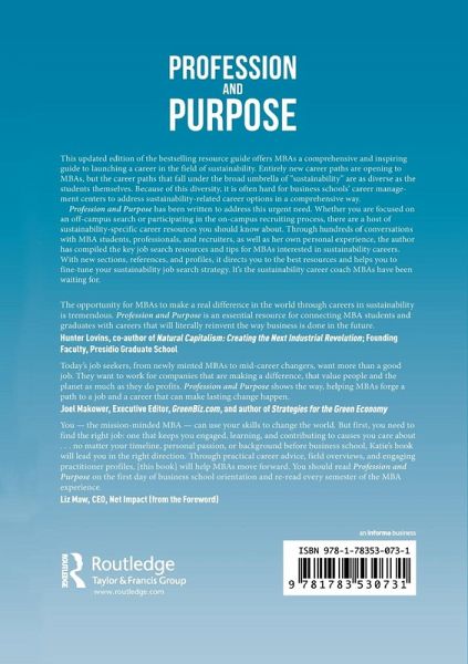 PrefaceAbout the author Acknowledgments Part I: Evaluating your optionsGetting started: MBA careers in sustainabilityWhat is sustainability?Sustainable jobs and internship optionsFraming your searchTips for an off-campus job searchMaking the most of informational interviewsGaining experienceGetting to your dream job: Start with the end in mind Plan B?A note about salariesStaying the course Organizing your searchPart II: Navigating specific career paths Corporate sustainability & CSRSustainability consultingSustainable real estate & green buildingEnergy & cleantechGreen marketingEnvironmental conservation/nonprofitsSocial entrepreneurship & impact investingSustainable investingMission-driven businessAdditional career pathsPart III: Job search resources Sustainable companiesInternet research resourcesJob posting websitesReportsBooksEventsGeographic search resources