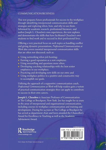 This text prepares future professionals for success in the workplace through identifying interpersonal communication skills and strategies and exploring when, how, and why to use them. Informed by academic research, professional literature, and author Joseph L. Chesebro's own experiences, the text explores and demonstrates the skills that have facilitated Chesebro's own students to find work and to succeed in their professional lives. Offering a very practical focus on such topics as handling conflict and giving dynamic presentations, Professional Communication at Work also covers essential interpersonal communication skills that are often not discussed, such as: Using networking when job hunting; Earning a good reputation as a new employee Using storytelling and questioning more often Developing coaching relationships with the best senior employees in our workplace, Practicing and developing new skills on our own, and Using workplace politics in a positive and constructive way to accomplish our goals. Utilizing the approach of a supportive communication coach, this text will help readers gain a variety of practical communication strategies they can apply to contribute to success in their own careers.