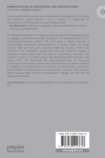This edited book presents contemporary empirical research investigating the use of language in professional settings, drawing on the contributions of a set of internationally-renowned authors. The book takes a critical approach to understanding professional communication in a range of fields and global contexts. Split into three parts, covering Business and Organisations, Healthcare, and Politics and Institutions, the contributors explore how and why academics engage in workplace research which takes the form of 'consultancy', 'advocacy' and 'activism'. In light of an ever-changing, ever-demanding global landscape, this volume offers new theoretical and methodological ways of conducting professional communication research with real-world impact. It will be of interest to linguistics and communication researchers and practitioners, particularly those working in sociolinguistics, discourse analysis, business communication, health communication, political communication, languageand the law and organisational studies.