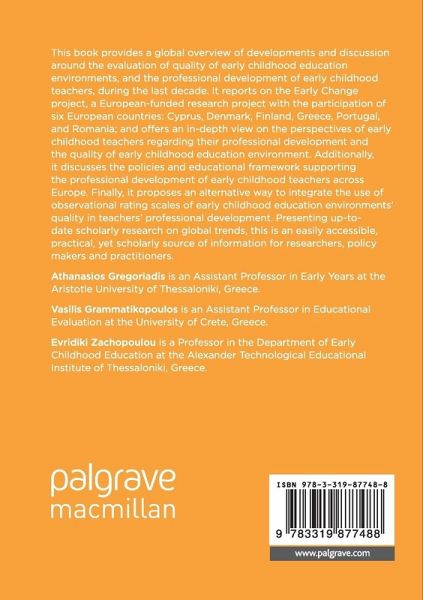 This book provides a global overview of developments and discussion around the evaluation of quality of early childhood education environments, and the professional development of early childhood teachers, during the last decade. It reports on the Early Change project, a European-funded research project with the participation of six European countries: Cyprus, Denmark, Finland, Greece, Portugal, and Romania; and offers an in-depth view on the perspectives of early childhood teachers regarding their professional development and the quality of early childhood education environment. Additionally, it discusses the policies and educational framework supporting the professional development of early childhood teachers across Europe. Finally, it proposes an alternative way to integrate the use of observational rating scales of early childhood education environments' quality in teachers' professional development. Presenting up-to-date scholarly research on global trends, this is an easilyaccessible, practical, yet scholarly source of information for researchers, policy makers and practitioners.