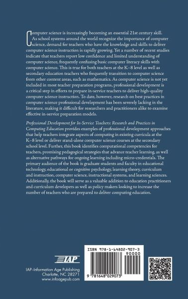 Computer science is increasingly becoming an essential 21st century skill. As school systems around the world recognize the importance of computer science, demand for teachers who have the knowledge and skills to deliver computer science instruction is rapidly growing. Yet a number of recent studies indicate that teachers report low confidence and limited understanding of computer science, frequently confusing basic computer literacy skills with computer science. This is true for both teachers at the K-8 level as well as secondary education teachers who frequently transition to computer science from other content areas, such as mathematics. As computer science is not yet included in most teacher preparation programs, professional development is a critical step in efforts to prepare in-service teachers to deliver high-quality computer science instruction. To date, however, research on best practices in computer science professional development has been severely lacking in the literature, making it difficult for researchers and practitioners alike to examine effective in-service preparation models. This book provide examples of professional development approaches that help teachers integrate aspects of computing in existing curricula at the K-8 level or deliver stand-alone computer science courses at the secondary school level. Further, this book identifies computational competencies for teachers, promising pedagogical strategies that advance teacher learning, as well as alternative pathways for ongoing learning including micro-credentials. The primary audience of the book is graduate students and faculty in educational technology, educational or cognitive psychology, learning theory, curriculum and instruction, computer science, instructional systems and learning sciences. Additionally, the book will serve as a valuable addition to education practitioners and curriculum developers as well as policy makers looking to increase the number of teachers who are prepared to deliver computing education.