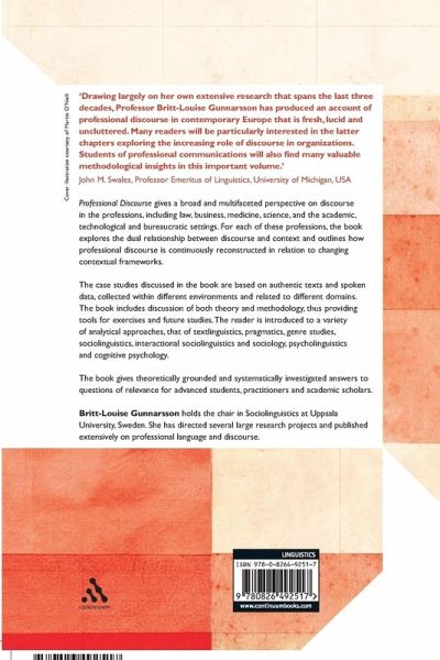 Professional Discourse gives a broad and multifaceted perspective on discourse in the professions. For each of these professions, the book explores the dual relationship between discourse and context, outlining how professional discourse is continuously reconstructed in relation to changing contextual frameworks. The case studies discussed in the book are based on authentic texts and spoken data, collected within different environments and related to different domains. The book includes discussion of both theory and methodology, thus providing tools for exercises and future studies. The reader is introduced to a variety of analytical approaches, that of textlinguistics, pragmatics, genre studies, sociolinguistics, interactional sociolinguistics and sociology, psycholinguistics and cognitive psychology. The book gives theoretically grounded and systematically investigated answers to questions of relevance for advanced learners, practitioners and academic scholars.