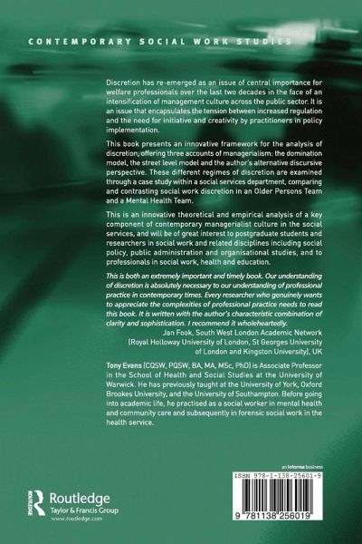'This is both an extremely important and timely book. Our understanding of discretion is absolutely necessary to our understanding of professional practice in contemporary times. Every researcher who genuinely wants to appreciate the complexities of professional practice needs to read this book. It is written with the author's characteristic combination of clarity and sophistication. I recommend it wholeheartedly.' Jan Fook, South West London Academic Network (Royal Holloway University of London, St Georges University of London and Kingston University), UK 'Tony Evans provides a convincing analysis of the key central issues in contemporary policy and practice that swirl around the place and function of professional discretion in welfare services. His critically engaged discussion draws out the complexities that have emerged from the intermingling of managerialism and professional culture. This original, perceptive and stimulating contribution deserves to be widely read.' John Harris, University of Warwick, UK 'The author provides and in-depth and comprehensive review of research on differing current perspectives of professional social work discretion in social services... This book makes a valuable contribution to the development of knowledge about social service organizations with regard to the role and nature of management and its impact on staff conduct and consumer services. The findings of this study have widespread implications for social service organizations around the world... this book forces the reader to think strategically about the nature and context of effective management in social services.' International Journal of Social Welfare 'Professional Discretion in Welfare Services is highly recommendable to anyone who is interested in this complex area of social services organisations... The book can be used in universities as a textbook or as a research resource, but it also provides good reading for managers and practitioners to get a grip over the