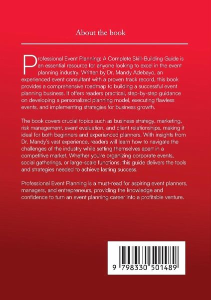 Professional Event Planning: A Complete Skill-Building Guide is an essential resource for anyone looking to excel in the event planning. Written by Dr. Mandy Adebayo, an experienced event consultant with a proven track record, this book provides a comprehensive roadmap to building a successful event planning business. It offers readers practical, step-by-step guidance on developing a personalized planning model, executing flawless events, and implementing strategies for business growth. The book covers crucial topics such as business strategy, marketing, risk management, event evaluation, and client relationships, making it ideal for both beginners and experienced planners. With insights from Dr. Mandy's vast experience, readers will learn how to navigate the challenges of the industry while setting themselves apart in a competitive market. Whether you're organizing corporate events, social gatherings, or large-scale functions, this guide delivers the tools and strategies needed to achieve lasting success. Professional Event Planning dives deep into crucial topics like business strategy, marketing, risk management, and event evaluation, providing actionable insights for planners at every stage. Whether you're just starting out or looking to refine your skills, this book delivers the tools you need to grow and succeed. With Dr. Mandy's expert advice, you'll gain the confidence to turn your passion into a profitable event planning business, making this an indispensable resource for planners, managers, and entrepreneurs ready to elevate their careers.