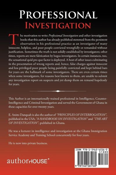 This Author is an internationally trained professional in Intelligence, Counter-Intelligence and Criminal Investigation and served the Government of Ghana in these capacities for over twenty years. E. Anim-Danquah is also the author of "PRINCIPLES OF INTERROGATION", published in the USA; "A HANDBOOK ON INVESTIGATION" and "THE ART OF INVESTIGATION", published in Ghana. He was a lecturer in intelligence and investigation at the Ghana Immigration Service Academy and Training School concurrently for four years. He is now into private business.