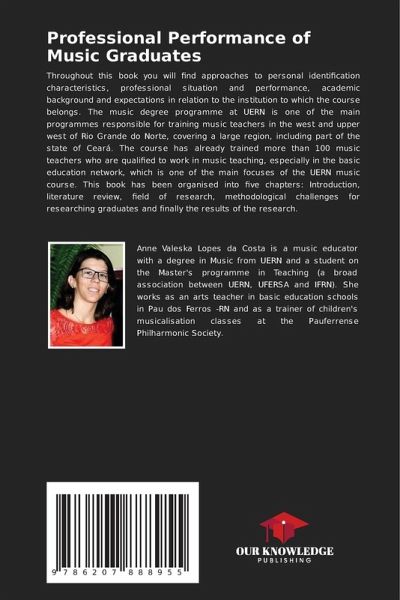 Throughout this book you will find approaches to personal identification characteristics, professional situation and performance, academic background and expectations in relation to the institution to which the course belongs. The music degree programme at UERN is one of the main programmes responsible for training music teachers in the west and upper west of Rio Grande do Norte, covering a large region, including part of the state of Ceará. The course has already trained more than 100 music teachers who are qualified to work in music teaching, especially in the basic education network, which is one of the main focuses of the UERN music course. This book has been organised into five chapters: Introduction, literature review, field of research, methodological challenges for researching graduates and finally the results of the research.